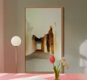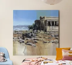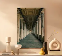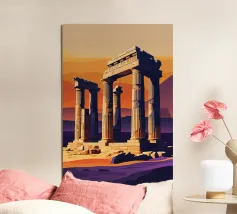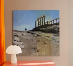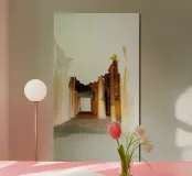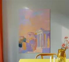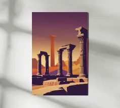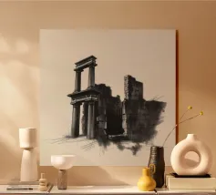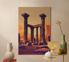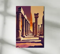 Una ricostruzione digitale di grande bellezza di un'architettura antica che si dissolve nella luce e nell'astrazione. I toni morbidi dell'ambra e dell'avorio si fondono con la precisione geometrica, dando l'impressione di rovine classiche in bilico tra presenza e memoria. La debole sagoma di una figura solitaria esalta la scala e la profondità emotiva, evocando temi di storia, decadenza e trascendenza.