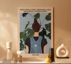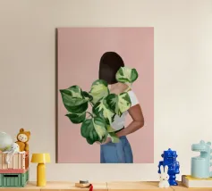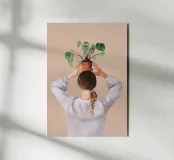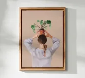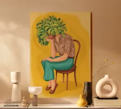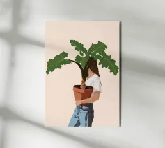 Un ritratto affascinante e dai toni tenui di una donna che tiene in equilibrio una pianta in vaso sulla testa, vista da dietro. Con la sua treccia infilata sotto un maglione accogliente e su uno sfondo neutro e caldo, questa illustrazione celebra l'armonia, la consapevolezza e un tocco di estrosità quotidiana. Un'opera d'arte da parete perfetta per gli amanti delle piante, per gli spazi dedicati allo yoga o per gli interni calmi e creativi.