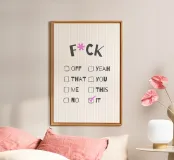 Un pezzo tipografico sfacciato e motivazionale per le giornate "da fare". Il titolo censurato "F*ck" si trova sopra le caselle di controllo disegnate a mano "OFF, THAT, ME, NO, YEAH, YOU, THIS" con un segno di spunta rosa acceso. Perfetto per uffici, studi, dormitori o pareti di gallerie; un regalo divertente per gli amici con senso dell'umorismo.