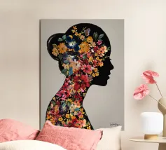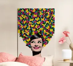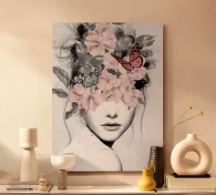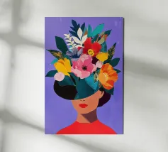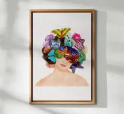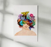 Collage disegnato e dipinto basato sulla propria fotografia. Ritratto di donna disegnato a mano e in digitale, con la testa ricoperta di farfalle e fiori. Un'esplosione di colori su uno sfondo tranquillo. Tutti i lavori di Good Blue sono realizzati senza l'uso di AI.
