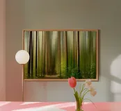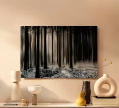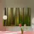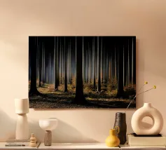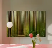 Paesaggio boschivo astratto con strisce di luce verticali. Le delicate tonalità di verde e la sfocatura dovuta al movimento conferiscono al soggetto un'atmosfera tranquilla, quasi meditativa, e ricordano una passeggiata in un bosco inondato di luce.