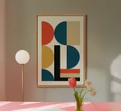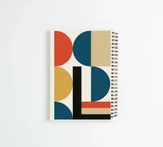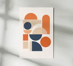 Poster chiaro in stile Bauhaus moderno. Forme geometriche in rosso, blu, oro e beige formano una composizione equilibrata su uno sfondo chiaro. Ispirato all'estetica classica del design: minimalista, potente e senza tempo. Ideale per interni moderni.