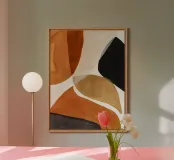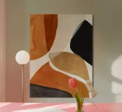 Una composizione astratta che bilancia il nero deciso, la terra di Siena e le forme morbide e neutre. Questo pezzo celebra il contrasto e il movimento con forme organiche e calde palette moderniste - ideale per spazi contemporanei, di metà secolo o dall'arredamento minimal.