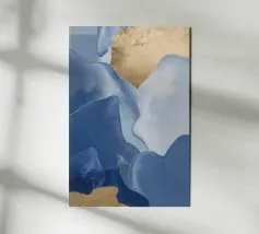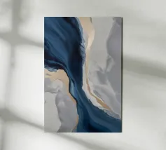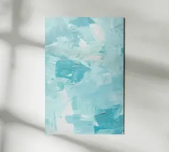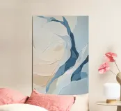 Pittura a olio astratta con forme bianche e blu chiaro, completate da beige, blu navy e grigio su uno sfondo chiaro. Curve e pennellate delicate creano una composizione minimalista e moderna con una superficie strutturata.