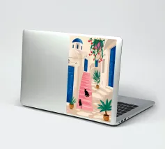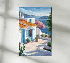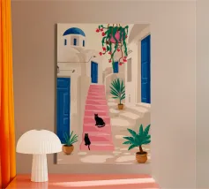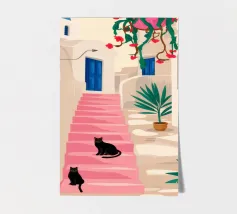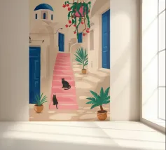 Un gatto nero scende con grazia una serie di scale blu in una pittoresca città mediterranea dalle mura bianche. La scena è un'istantanea affascinante, serena e leggermente misteriosa della vita costiera.