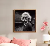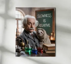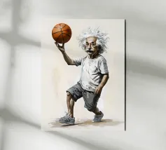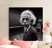 Albert Einstein davanti ai suoi appunti di genio. Una caricatura della straordinaria mente scientifica.
