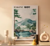 Il disegno "Hakone" mostra un pittoresco paesaggio montano con onsen ad Hakone, in Giappone, ispirato ai classici ukiyo-e e rifinito con delicati elementi ad acquerello. Perfetto per gli amanti dell'arte tradizionale giapponese e dei momenti di relax nella natura!