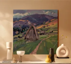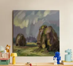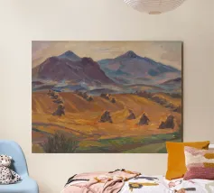 A serene landscape centered on a well-formed haystack standing in a field characterized by gently rolling hills in muted shades of purple and green, all under a soft, calm sky.
