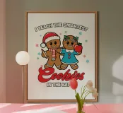 Due sorridenti biscotti di pan di zenzero sono vestiti a festa, uno con un cappello da Babbo Natale e l'altro con una mela in mano. La frase "Insegno ai biscotti più intelligenti del lotto" è stampata intorno a loro, aggiungendo un tema giocoso ed educativo.