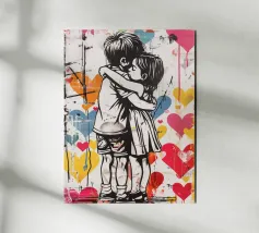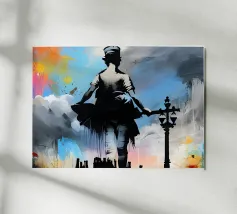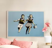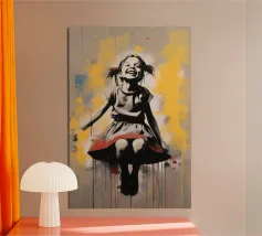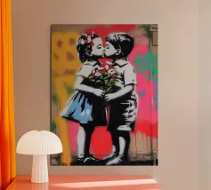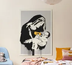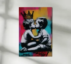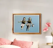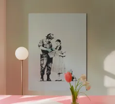 Questo spiritoso e inquietante stencil di Banksy ritrae due bambini che corrono allegramente vestiti con giubbotti antiproiettile della polizia. L'immagine satireggia la militarizzazione forzata e la perdita dell'innocenza nella società moderna. Mescolando i simboli dell'infanzia con l'equipaggiamento delle forze dell'ordine, Banksy critica la presenza pervasiva della violenza e dell'autorità.
