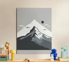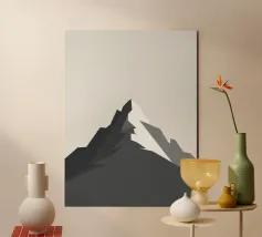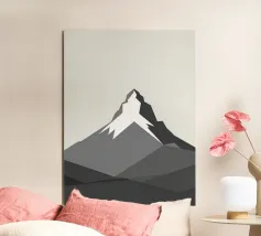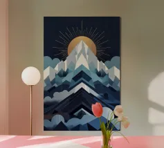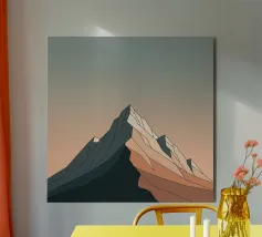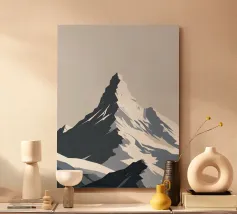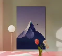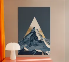 Una rappresentazione artistica del K2 racchiusa in un triangolo geometrico, che simboleggia la struttura imponente e la simmetria della montagna. La combinazione di colori pastello chiari e ombre profonde crea un'atmosfera di calma e meraviglia. L'uccello che vola vicino al triangolo accentua il tema della libertà e dell'esplorazione. Quest'opera d'arte bilancia semplicità e profondità, offrendo un viaggio visivo in una delle più grandi meraviglie della natura, racchiusa in un design moderno.
