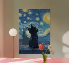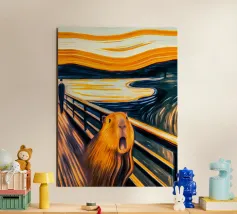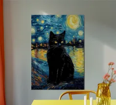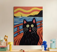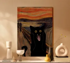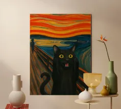 "Questa parodia giocosa rende omaggio in forma felina a uno dei dipinti più iconici della storia dell'arte, opera del celebre Edvard Munch. Questa ingegnosa illustrazione trasforma l'opera classica con l'inserimento di un adorabile gatto, aggiungendo un tocco di umorismo e fascino. Sappiamo che questo pezzo è perfetto per gli amanti dei gatti, ideale per decorare il vostro spazio preferito con un tocco di creatività e amore per l'arte".
