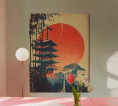 Immergetevi nella serena bellezza del Giappone con questo poster di viaggio minimalista ispirato agli iconici templi a pagoda di Kyoto. Caratterizzato da audaci forme geometriche, cerchi del sole e della luna sovrapposti e ricche tonalità rosso acqua, quest'opera d'arte fonde il design moderno con la calma tradizionale. Perfetta come stampa da parete per gli amanti della cultura giapponese, dell'arredamento zen e dell'arte grafica di viaggio. Un'opera d'effetto per qualsiasi spazio.