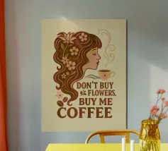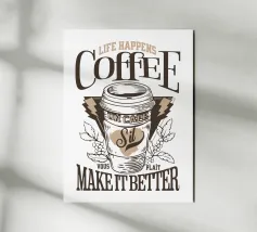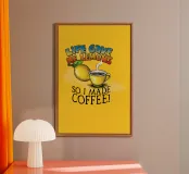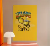 Un'opera d'arte umoristica con un vivace sfondo giallo, un limone, una tazza di caffè fumante e un testo scherzoso che recita "Life Gave Me Lemons So I Made Coffee". Perfetto per progetti motivazionali o spensierati.