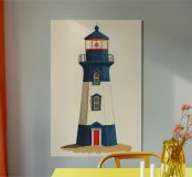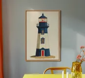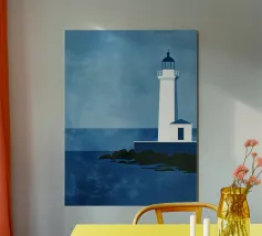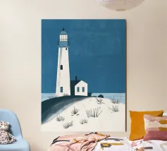 L'immagine mostra un affascinante faro in uno stile stilizzato e illustrato. La combinazione di colori è chiara e decisa: un motivo blu e bianco con un ingresso rosso e dettagli delle finestre. La parte superiore della torre è sottolineata da una galleria con ringhiere e da una finestra delineata in rosso, in cui è visibile una lampada. Il faro si erge su uno sfondo sabbioso. Lo stile ricorda un misto di grafica e illustrazione classica: linee chiare, colori piatti e una rappresentazione stilizzata, quasi giocosa.