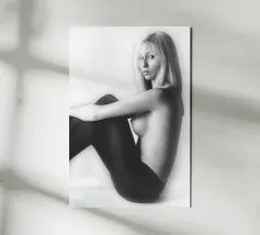 Una giovane donna seduta, in posa in topless con guanti neri e gonna corta