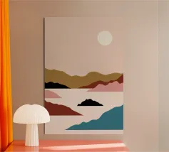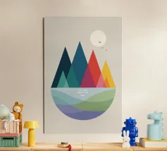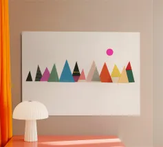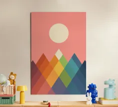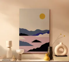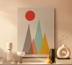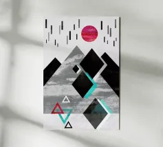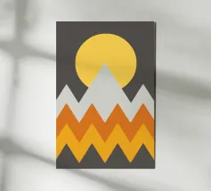 Le forme geometriche formano un paesaggio montano minimalista, con un cerchio in alto che ricorda il sole. Sotto è raffigurato un riflesso invertito delle cime, che crea un disegno simmetrico.
