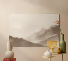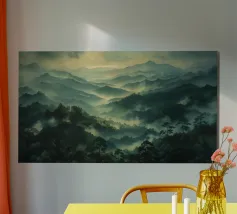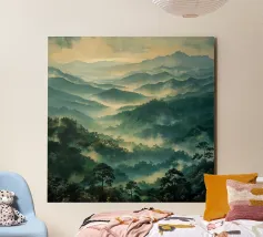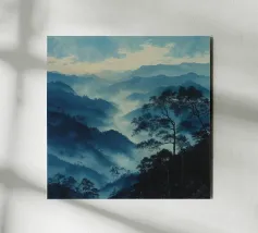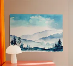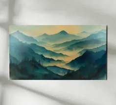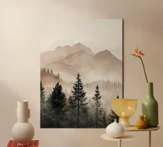 Un paesaggio nebbioso e tonale di alberi stagliati e strati montuosi attenuati, questo acquerello espressivo evoca mattinate tranquille, creste lontane e il silenzio di una natura incontaminata. Perfetto per interni moderni che cercano quiete, profondità e mistero naturale.