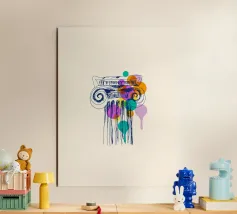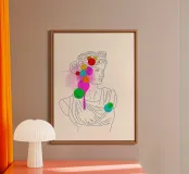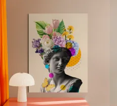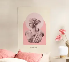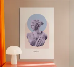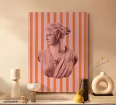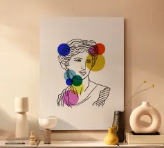 Una reinterpretazione contemporanea della bellezza antica. Quest'opera d'arte presenta la silhouette di una statua greca sovrapposta a una geometria minimalista e colorata, che dà nuova vita all'antichità classica. Perfetto per gli amanti della storia, dell'arte e degli interni raffinati.