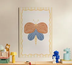 La rappresentazione stilizzata di una falena presenta intricati disegni sulle ali, che incorporano motivi naturali e celesti. Le ali presentano delicati contorni di rami e forme di luna crescente, su una tavolozza di colori tenui.