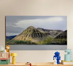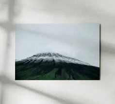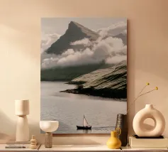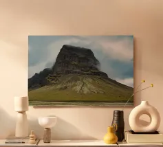 The rugged peaks rise above the mist like ancient guardians, their silhouettes softened by the swirling fog. Wisps of clouds drift lazily across the sky, casting fleeting shadows over the ridges and valleys. In the distance, sunlight pierces through the cloud cover, illuminating parts of the mountain with a golden glow, while the rest remains shrouded in a mysterious, ethereal haze.