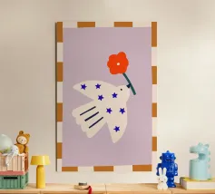Questo poster dal design accattivante raffigura una colomba bianca con dei fiori, simbolo di pace e speranza. I colori tenui e le strisce grafiche conferiscono al motivo un aspetto tranquillo e moderno. Ideale per il soggiorno, la camera dei bambini o le zone giorno tranquille, è perfetto per chi desidera arredare la propria casa con un messaggio positivo e armonioso.