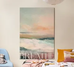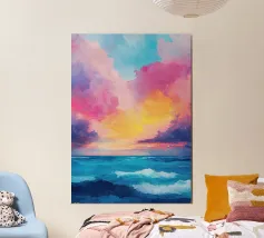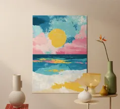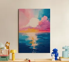 Una scena minimalista vi trasporta in un mondo di pace e armonia. Nuvole rosa e gialle fluttuano in un mare azzurro di nuvole, delicatamente illuminato da una luce soffusa. Le dolci increspature sulla superficie dell'acqua e la fresca tavolozza di colori esaltano l'atmosfera pacifica. Immergetevi in questo mondo da sogno e trovate un momento di relax.
