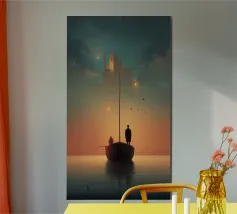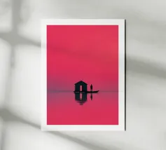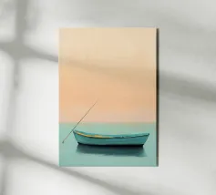 Illustrazione piatta di un uomo anziano e del suo giovane figlio in piedi sul bordo della loro piccola barca rossa, con l'acqua blu chiaro sotto di loro. Lo sfondo è costituito da toni tenui di arancione e giallo chiaro, che creano un'atmosfera serena. Questa scena minimalista trasmette un senso di calma e il legame tra padre e figlio in armonia.