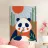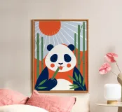 Godetevi una vivace illustrazione della fauna selvatica con un panda che mangia il bambù e un'alba sullo sfondo.