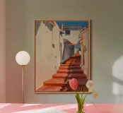 Uno stretto passaggio illuminato dal sole tra edifici bianchi è caratterizzato da una serie di scale rosso cremisi che creano una composizione audace, grafica e architettonicamente interessante, ricca di fascino mediterraneo.