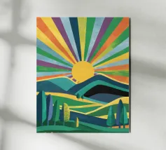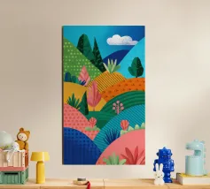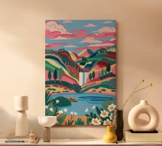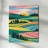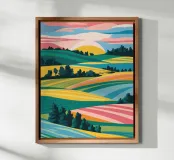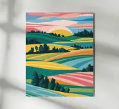 Un dipinto paesaggistico espressivo e vibrante di campi ondulati, simili a patchwork, nei toni del verde, del giallo e del rosa. Lo stile pittorico cattura la bellezza dinamica e la consistenza della campagna.