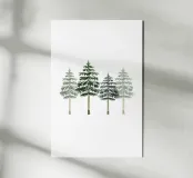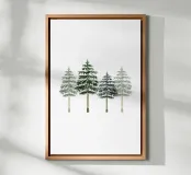 Dieses stimmungsvolle Aquarellbild zeigt vier detailreich gemalte Tannenbäume in verschiedenen Grüntönen – von sattem Waldgrün bis hin zu neblig-zartem Grau. Die natürliche Anordnung und die feine Pinselführung verleihen dem Motiv Ruhe, Tiefe und eine winterlich-märchenhafte Atmosphäre. Ideal für alle, die Naturmotive lieben und ihrem Zuhause eine sanfte Waldstimmung schenken möchten.
