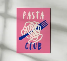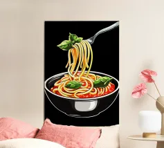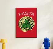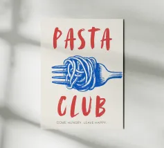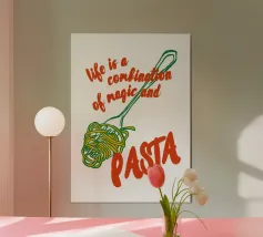 Tagliatelle su sfondo rosso con foglie di basilico e scritta Pasta