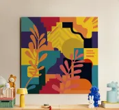 A bold abstract composition of stylized leaves and geometric shapes in primary colors of yellow, red, and blue, creating a vibrant and structured design.