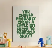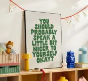 Caratterizzato da audaci scritte verdi disegnate a mano su un morbido sfondo beige, questo pezzo emana calore e autocompassione. Il contrasto sorprendente crea un punto focale che si adatta a qualsiasi stile di arredamento. Perfetto per chi vuole infondere positività e amore per se stesso nel proprio ambiente. Ideale per camere da letto, uffici o spazi abitativi, questa stampa aggiunge un delicato richiamo alle pareti. L'aspetto artigianale delle scritte conferisce all'opera un'atmosfera personale e invitante. Trasformate la vostra casa con questo pezzo edificante che incoraggia un discorso più gentile su di sé e il benessere emotivo.
