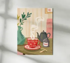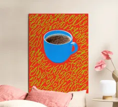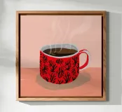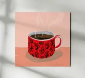 Un'illustrazione ravvicinata di una tazza di caffè o tè fumante in una vivace tazza rossa con un motivo dettagliato e intricato. L'opera d'arte accogliente e dettagliata è un caldo invito a fare una pausa.