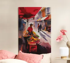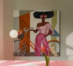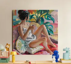 Questa opera d'arte mostra una persona seduta su una sedia a righe, circondata da girasoli e da una borsa verde. Lo sfondo è di un marrone tenue che crea un'atmosfera rustica e riflessiva.