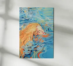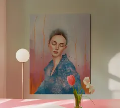 Un delicato ritratto di donna con fluenti capelli biondi o castano chiaro, con gli occhi chiusi o lo sguardo rivolto verso il basso, che indossa un abito blu e argento o bianco dai dettagli intricati che suggeriscono pizzi o armature.