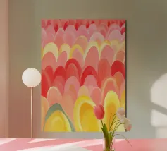 Un dipinto astratto giocoso ma sereno, con forme morbide e arrotondate e tonalità calde. Quest'opera d'arte dona un senso di armonia e leggerezza a qualsiasi ambiente.