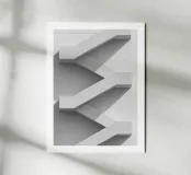 Poster in bianco e nero di un'architettura minimalista: scala esterna zigzagante, attaccata a una facciata chiara e tagliata da una luce ad angolo basso che proietta lunghe ombre grafiche. Linee pulite, cemento strutturato e un ritmo ripetitivo creano un'immagine geometrica ipnotica. Un elegante poster da parete per il soggiorno, l'ufficio o il corridoio, che dona sollievo, modernità ed equilibrio agli arredamenti contemporanei, scandinavi, industriali o giapponesi.