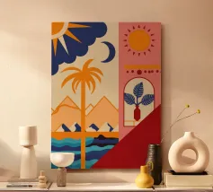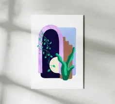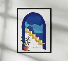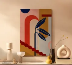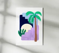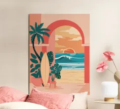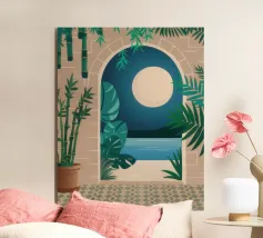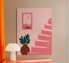 Una scena d'interni stravagante e astratta con una scala rosa, piante in vaso e un sole e una luna nel cielo visti attraverso un arco. L'opera d'arte è un paesaggio da sogno giocoso e bohémien.