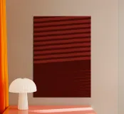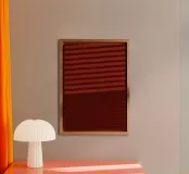 Linee spesse e sottili di colore rosso mattone, dai bordi morbidi e dalla texture sfumata, su uno sfondo marrone scuro e rossastro. Sviluppato dal gioco di luci e ombre delle persiane.
