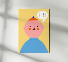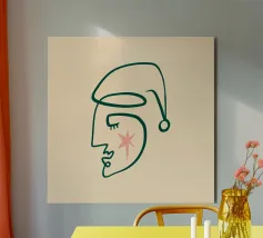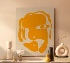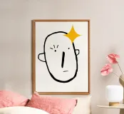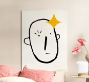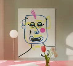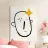 Un volto semplicistico e astratto è disegnato con linee nere decise e presenta una stella gialla sulla fronte. L'espressione è minimale, con piccoli punti per gli occhi e una linea retta per la bocca.