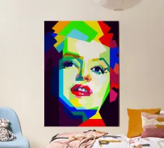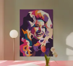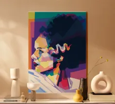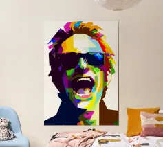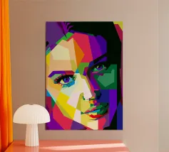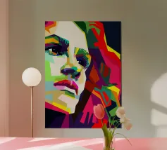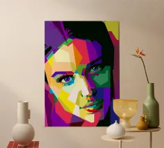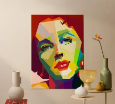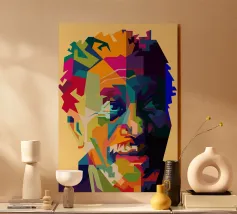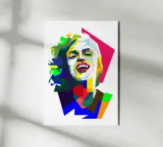 Un ritratto vibrante e geometrico di Sinead O'Connor in stile WPAP, caratterizzato da forme audaci e angolari e da un'impressionante gamma di colori vivaci e contrastanti. L'opera cattura i suoi tratti iconici, come la testa rasata, gli occhi penetranti e la forte espressione facciale, utilizzando blocchi di colore nitidi e frammentati. La composizione enfatizza la profondità e l'emozione mantenendo l'estetica pop-art cubista distintiva di WPAP, creando un tributo visivamente dinamico e moderno alla leggendaria cantante.