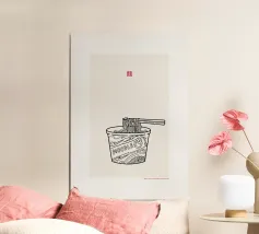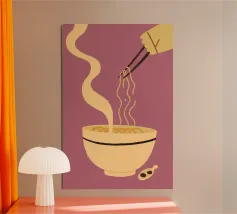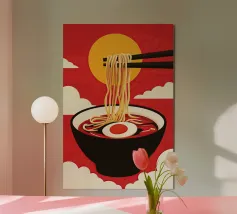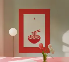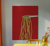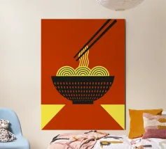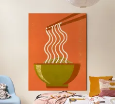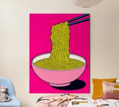 Audace e giocosa, questa illustrazione grafica pop art presenta spaghetti giallo brillante sollevati da bacchette su uno sfondo rosso vibrante: un'eccentrica celebrazione del divertimento, del cibo e del colore.