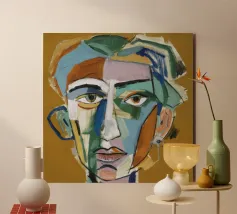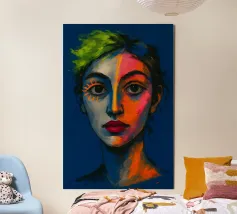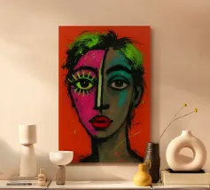 Un ritratto stilizzato si divide al centro: un lato dipinto con una lussureggiante pennellata di smeraldo, l'altro con pennellate di rosa elettrico, arancione e giallo che formano un occhio da cartone animato. Macchie di pigmento al neon circondano la testa come scintille di ispirazione. Il contrasto tra il realismo pittorico e l'estrosità della grafica pop invita a riflettere sulle maschere che indossiamo. Stampato su carta opaca di qualità museale con inchiostri d'archivio, questo pezzo audace intensifica gli spazi di lavoro creativi, le gallerie o gli angoli di lettura, stimolando il dialogo sull'identità, la percezione e il vivido spettro dell'espressione umana.