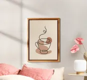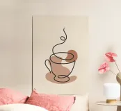 Un design minimalista mostra una tazza fumante disegnata con una linea continua. Le morbide tonalità del marrone creano un'atmosfera calda e accogliente su uno sfondo chiaro.