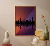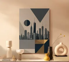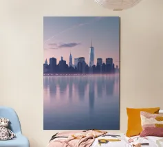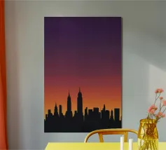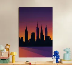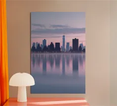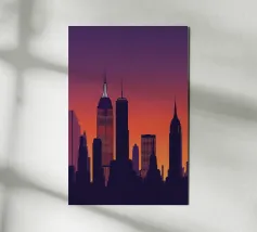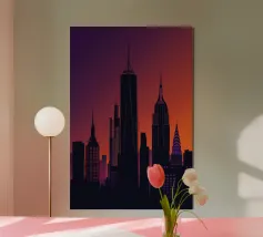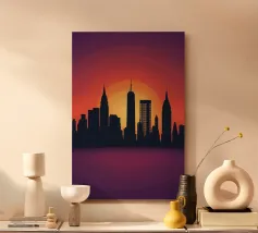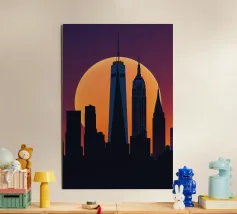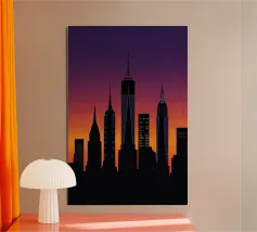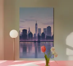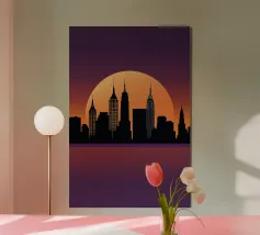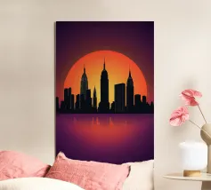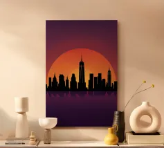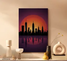 Celebrate l'ipnotica bellezza dello skyline di New York City riflesso su acque serene. Questa silhouette minimalista cattura i punti di riferimento più iconici della città, come l'Empire State Building e il One World Trade Center, su uno sfondo ricco di sfumature arancioni e viola al tramonto. Ideale per gli appassionati di arredamento moderno, questo pezzo evoca la raffinatezza urbana pur mantenendo un'estetica tranquilla ed elegante.