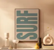 Questo poster di surf in blu e beige porta lo spirito della spiaggia, del mare e del surf direttamente sulla vostra parete. Con una tipografia moderna, è la decorazione murale perfetta per il soggiorno, la camera da letto o il corridoio.