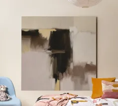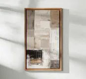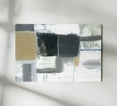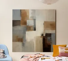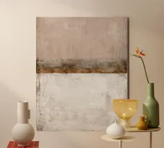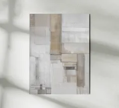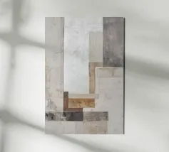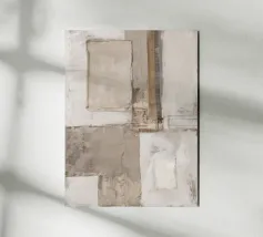 Questo disegno astratto combina elementi industriali con colori terrosi e forme minimaliste. Le texture stratificate di carta e materiali da costruzione, combinate con pennellate, creano un'affascinante profondità e riflettono lo stile boho del design contemporaneo.